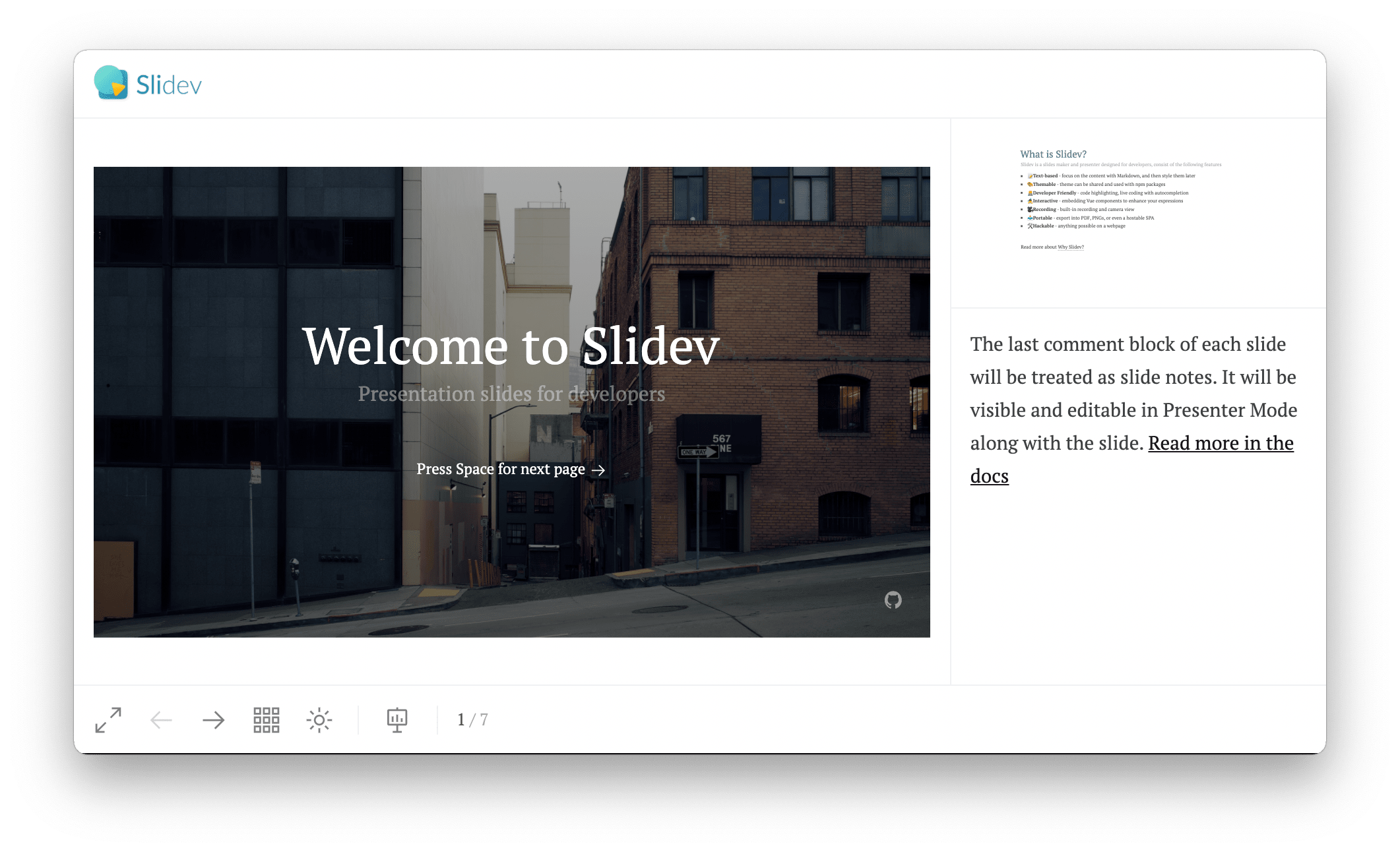 To enter the presenter mode, you can click the button in the navigation panel, or visit http://localhost:<port>/presenter.